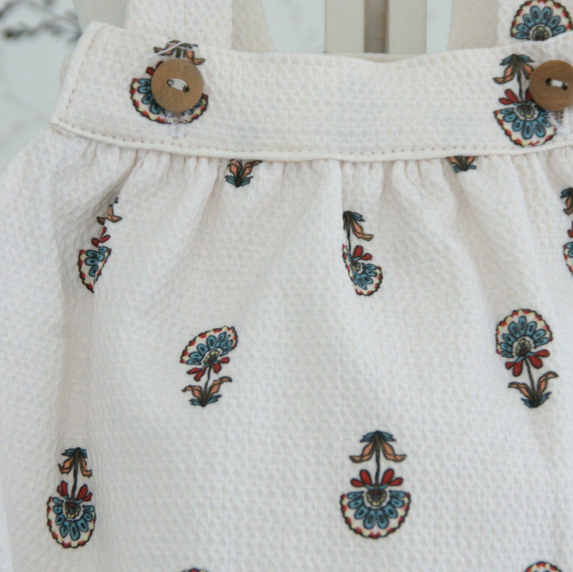 Peto forrado en el interior, con tirantes y botones de madera. La parte inferior se abre también con botones que facilitan el cambio de pañal. Fabricado en cualquiera de las telas de la colección y en diferentes tallas.